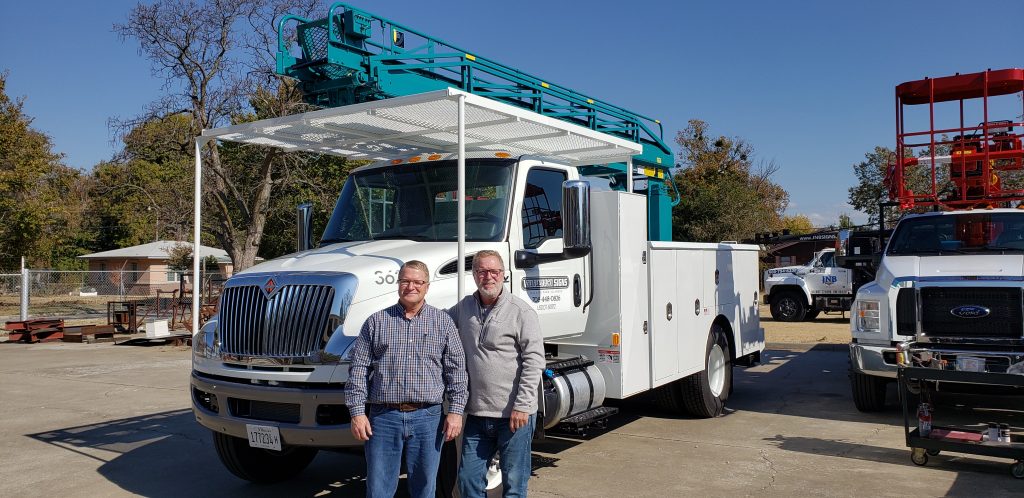 Wilkie model 60 ladder 60 feet working height 360 degree working radius with 45 feet of side reach at 0 degrees, controls at base and workman’s platform. Full service body with additional over sized lamp box, custom full rear step bumper with receiver hitch. mounted on International MV truck with diesel automatic , AC, Cruise , Tilt steering. This unit is SOLD but we can build one for you today. Call Darrel or Bryan at 405-235-0920
