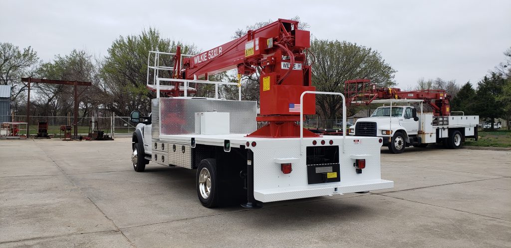 Wilkie model 52XLR 52 foot working height two man power level power rotate basket with jib winch in basket and mainline winch rated at 1000 pounds